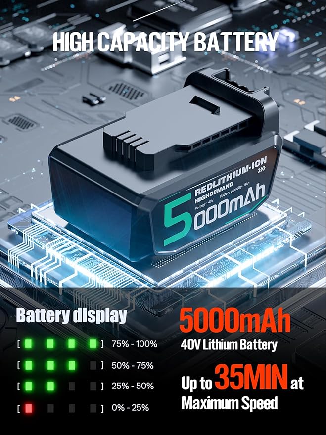 - Long-Lasting Runtime: Equipped with a high-capacity 5000mAh battery, our battery powered leaf blower offers impressive runtime up to 55 minutes of continuous working on a single charge, letting you finish big jobs
