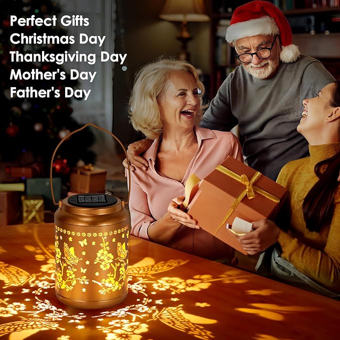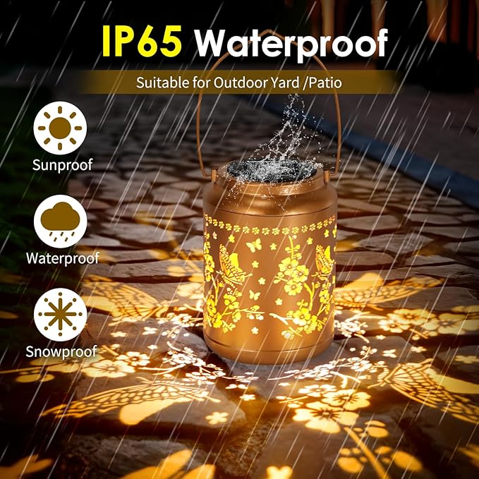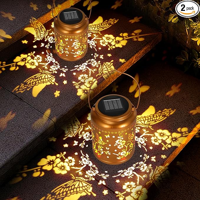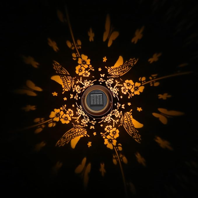 - Graceful Garden Decorations: Solar lantern light can project unique and beautiful Butterfly patterns in a dim environment, bring life and fun to your garden and attract your family or friends. Beautiful gold copper metal veneer and retro hollow out design give it an artistic touch