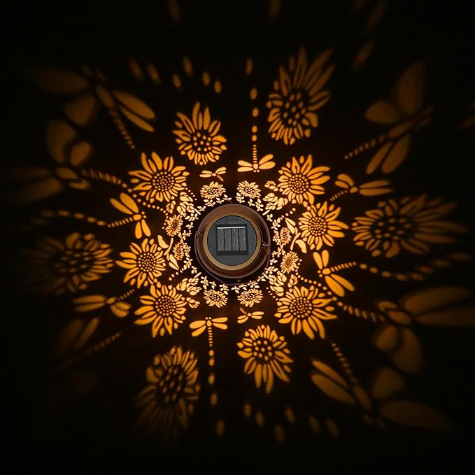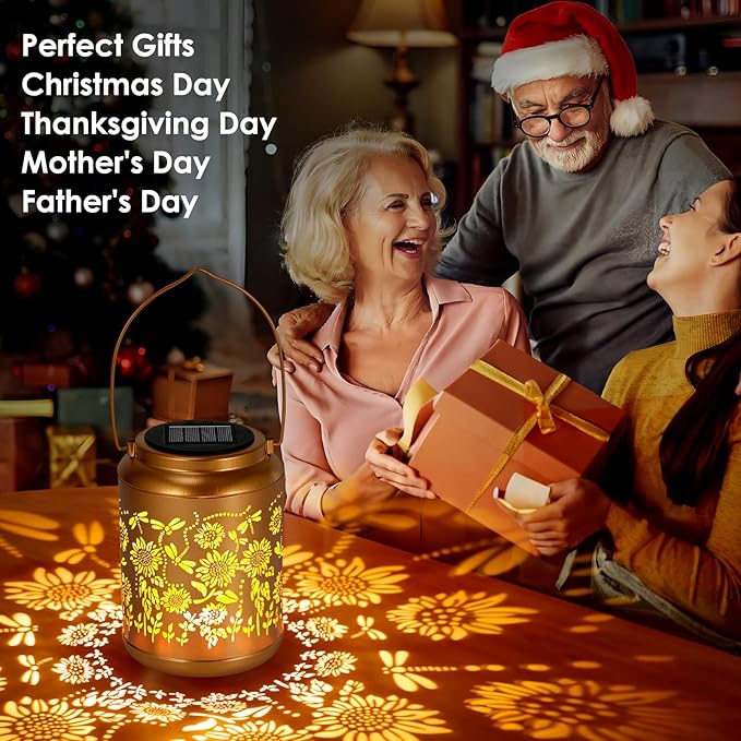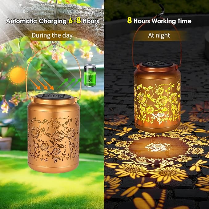 - Graceful Garden Decorations: Solar lantern light can project unique and beautiful Butterfly patterns in a dim environment, bring life and fun to your garden and attract your family or friends. Beautiful gold copper metal veneer and retro hollow out design give it an artistic touch