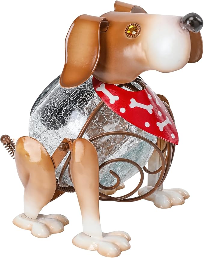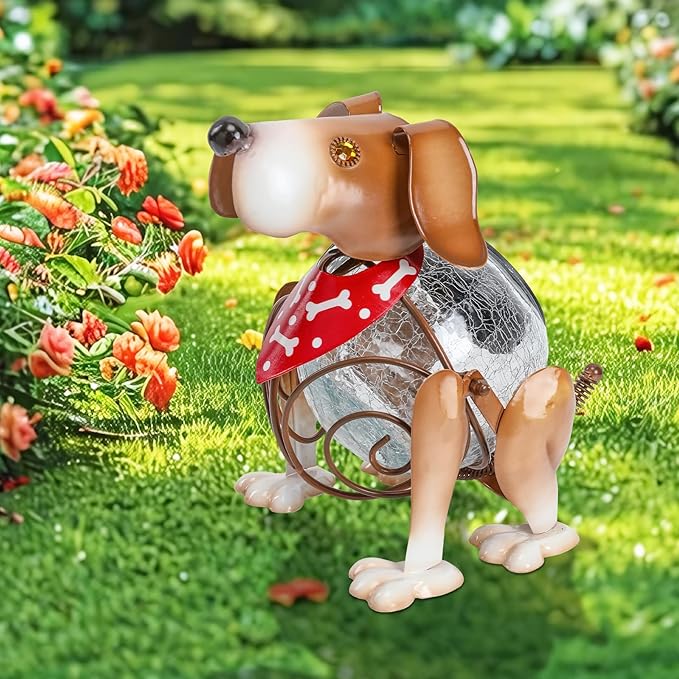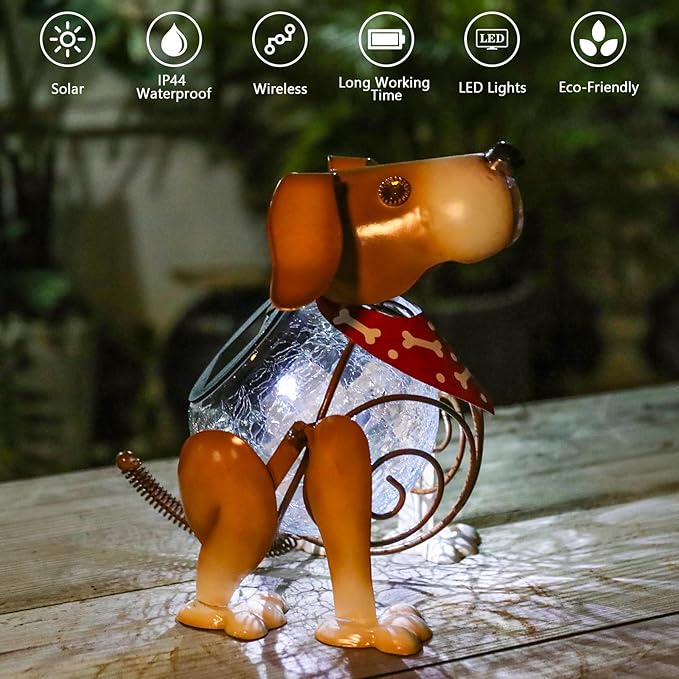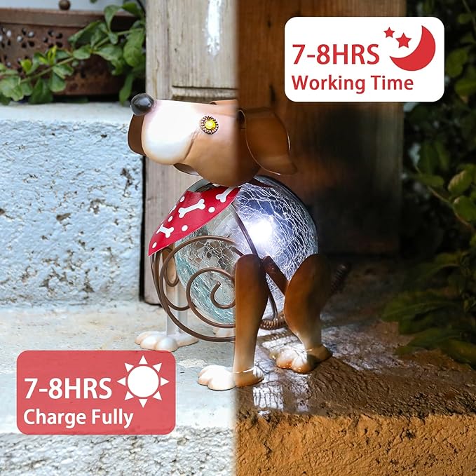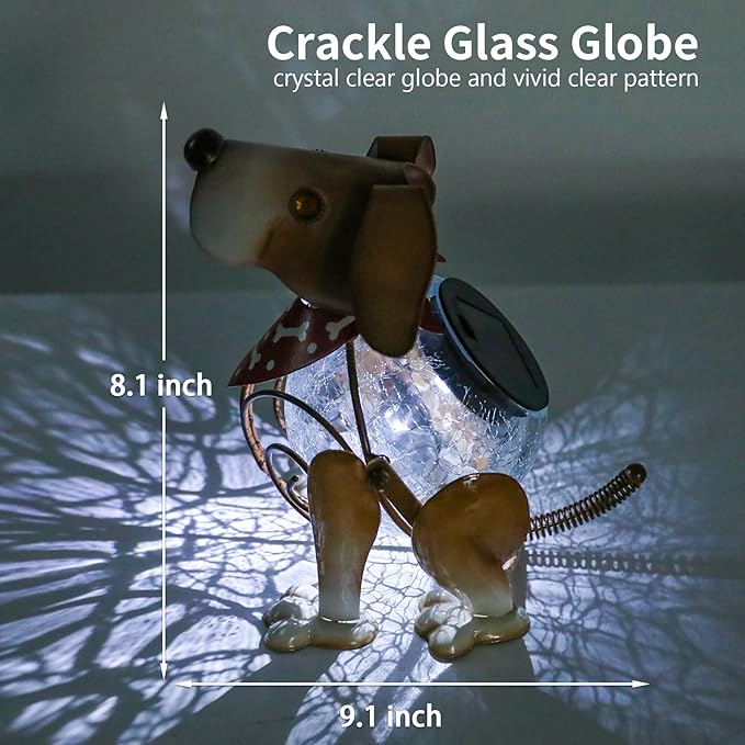 - Animal solar light is designed into a cute dog shape and its body with crackle glass globe light, this yard art is suitable for outdoor decoration and make a adorable landscape to your home