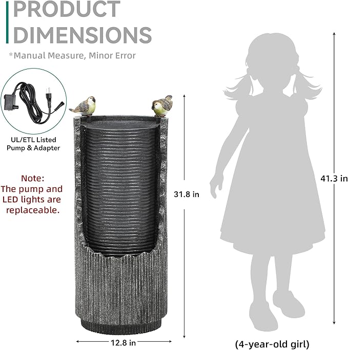 - EASY & SAFE USE: Equipped with an upgraded ETL/UL-Listed pump, 6ft standard power cord, easy to blend with any outdoor setting, just add water, plug-in and enjoy with 1-year manufacturer’s warranty. Warm Tips: During freezing temperatures, please drain the fountain, disconnect the pump, and store indoors.