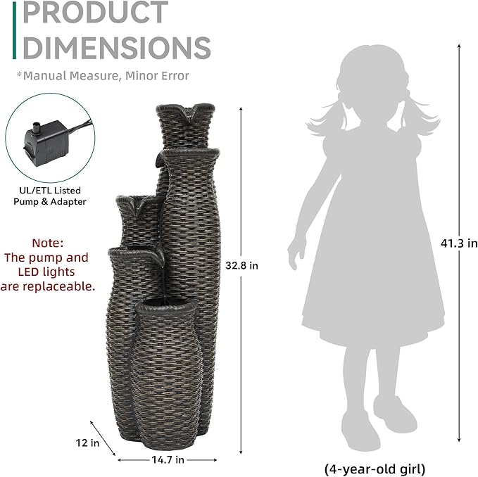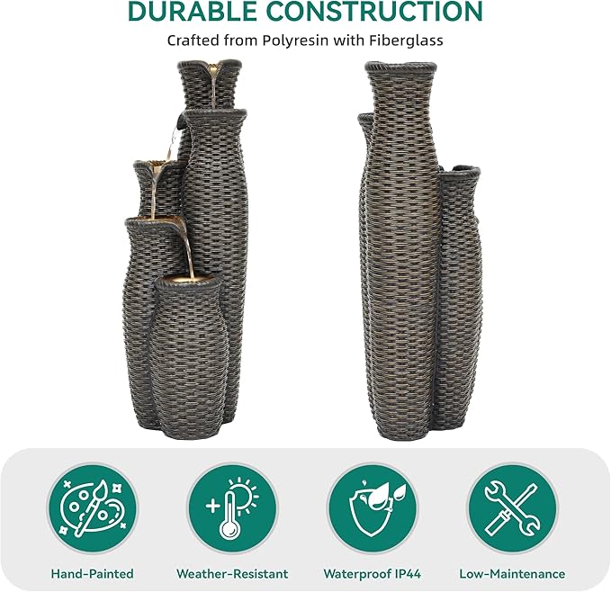 - UNIQUE WOVEN-INSPIRED DESIGN: Our elegant tall 5-tier vase outdoor fountain, sized at 14.76"L X 12.01"W X 32.87"H, boasting a one-of-a-kind 3D faux rattan texture. This outdoor resin fountain combines modern aesthetics with natural charm. It's not just a fountain; it's a statement piece that will instantly elevate the aesthetics of your garden, patio, or backyard.