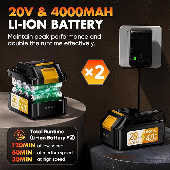 - 🔋【2*4.0AH & 20V Lithium Batteries】Our cordless leaf blower is equipped with Dual 4.0AH lithium batteries, providing up to 120 minutes of runtime in low-speed mode and 30 minutes in high-speed mode. A convenient battery indicator (25%-50%-75%-100%) lets you monitor remaining power and charging progress with ease. Plus, the built-in protection system automatically shuts off the motor and battery, extending their lifespan and ensuring safe,continuous performance for all your outdoor cleaning needs