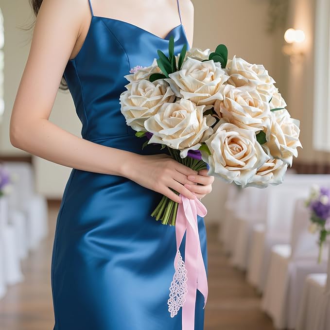 - Packaging and Specifications:For artificial flowers, we offer a variety of options, with 12-piece and 24-piece fake roses for you to choose from. These roses artificial flowers are approximately 16.9 inches long each, with stems about 14.1 inches long and flower heads about 3.5 inches in diameter. Each flower has 6 leaves and approximately 23 petals. The leaves are realistically shaped with serrated edges and clear veins, and the colors also show natural light and shadow changes.