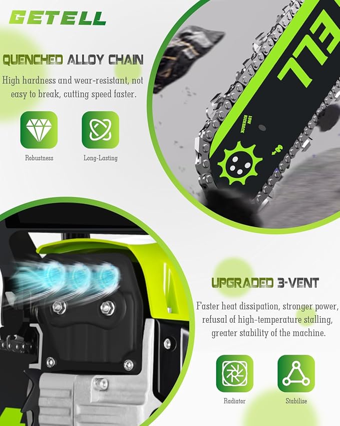 - Pro-Grade Safety for Total Peace of Mind: Work confidently with a full suite of advanced safety features. This professional chain saw includes a rapid-reaction chain brake, a safety throttle, and an ergonomic non-slip handle for complete control