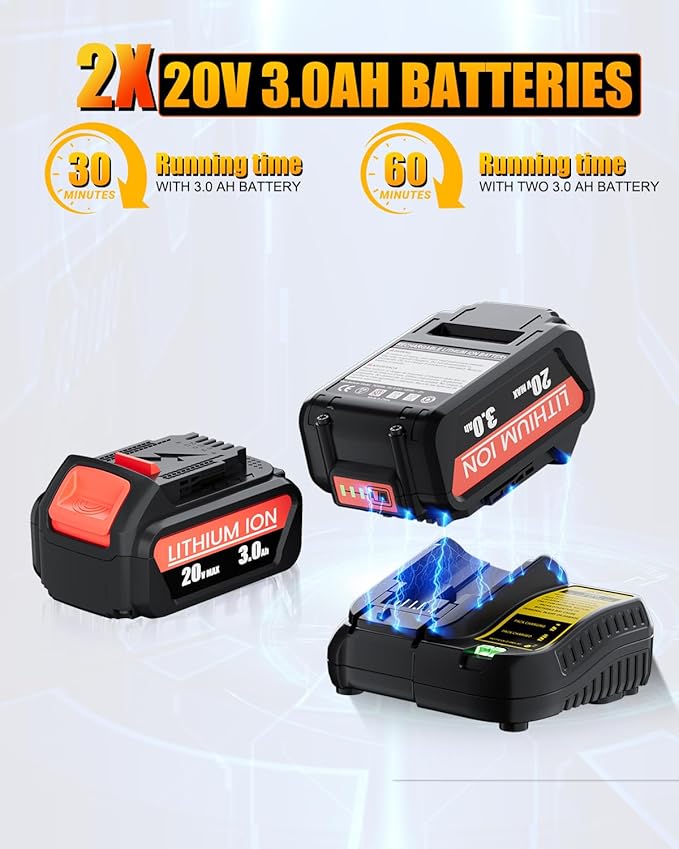 - Upgrade to 2 Batteries and 1 Fast charger: The Nyveyoo Cordless Leaf Blower comes with two 20V 3.0Ah batteries and a quick charger for up to 30 minutes of use at maximum power and 60 minutes at medium power. The batteries are compatible with all DEWALT 20V tools and chargers, ensuring versatility. With the quick charger, the batteries can be fully charged in just 2 hours, minimizing downtime and ensuring you work efficiently.
