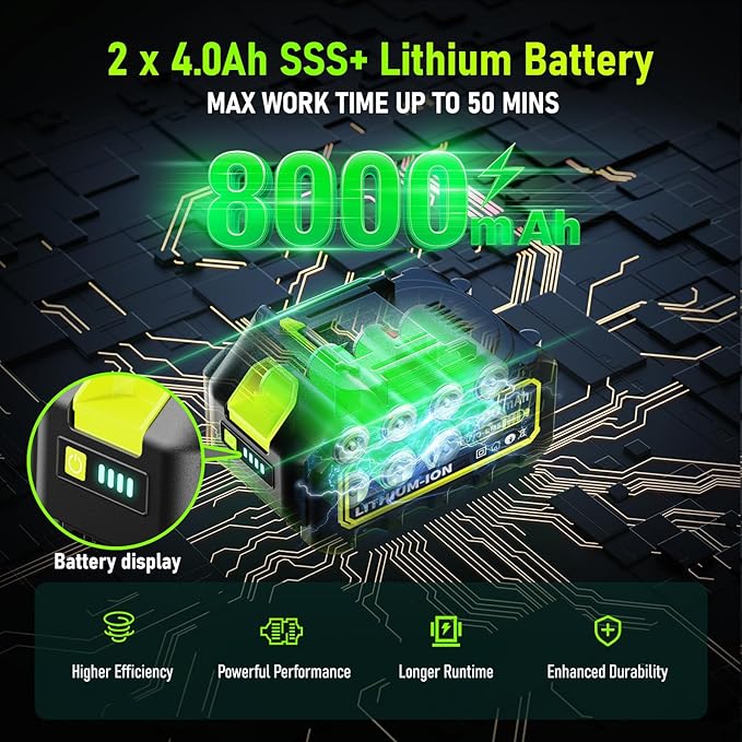 - 【Two Long-lasting Batteries with Power Display】The leaf blower cordless comes with two 21V 4000mAh batteries and a fast charger, providing up to 50 minutes of continuous runtime. The battery level indicator allows real-time power monitoring. For more efficient yard maintenance, the included charger is designed for fast charging, quickly replenishing the batteries. With no cords required, it delivers a faster, more convenient, and smoother cleaning experience.