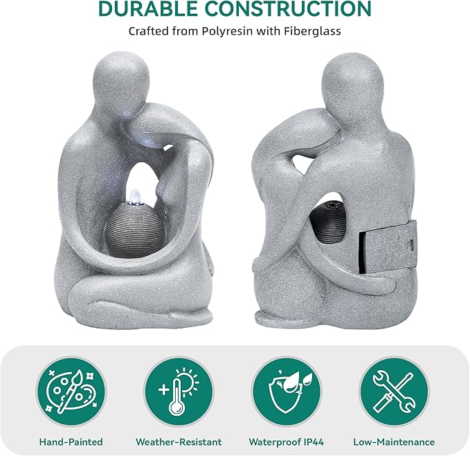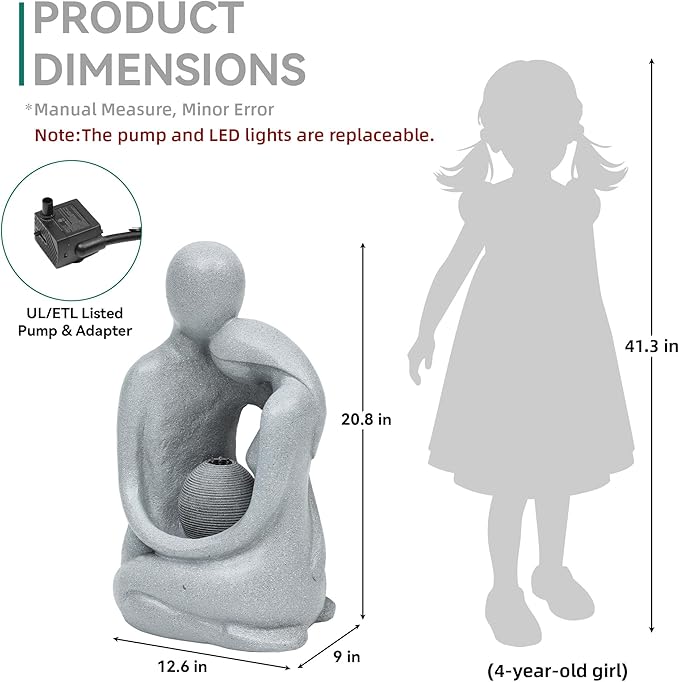 - MODERN HUGGING COUPLE SILHOUETTE FOUNTAIN: This beautifully crafted couple outdoor fountain features a modern couple silhouette design. Inspired by the tender embrace of a couple, it adds modern aesthetics and a peaceful ambiance to any garden or home. Measuring 12.6"L X 9.06"W X 20.87"H, it's the versatile size for your indoor&outdoor space.