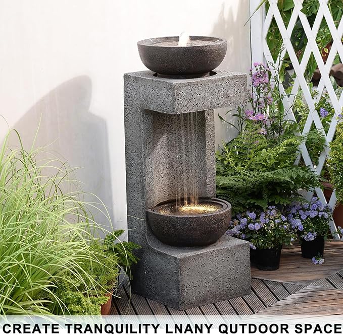 - Weather-Resistant Resin for Year-Round Use: Crafted from high-quality resin and fiberglass, this outdoor waterfall fountain is built to withstand sun, rain, and temperature changes. The realistic grey stone-look finish blends effortlessly into both modern and natural outdoor settings, adding timeless charm to your patio or garden. (For winter months in freezing climates, we recommend moving the fountain indoors to prevent ice damage.)