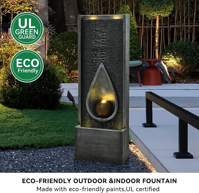 - LED Modern Style Outdoor Garden Water Fountain: Built-in soft LED strip lights illuminate the flowing water as it gently flows down the cascading structure, enhancing the aesthetics of the water and creating a relaxing atmosphere, making it an ideal focal point for evening relaxation in the garden, patio or backyard, as well as a good partner for yoga or meditation