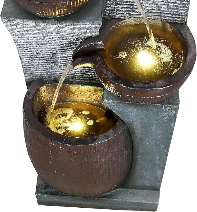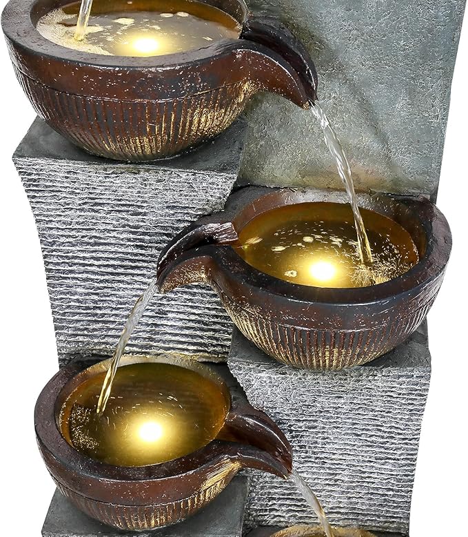 - Stunning Day & Night LED Illumination: Integrated LED lights highlight the cascading water and textured, pottery-inspired tiers after dark, while the rustic, earthy design shines with natural charm during the day.